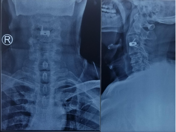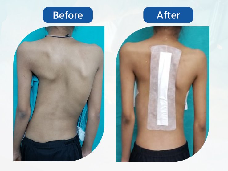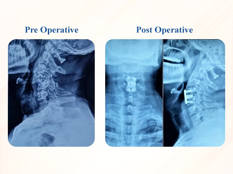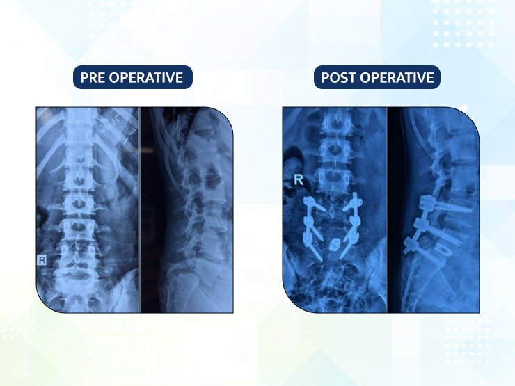 The post-op X-ray shows the remarkable correction achieved after surgery.